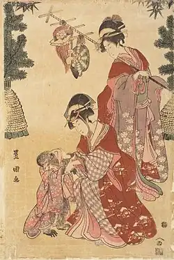 The Mountain and Monkey Gods Sannō and Sarugami became popular during the early Tokugawa or Edo period. Toyotomi Hideyoshi, who unified Japan in 1590 and ended the Sengoku period, was nicknamed Kosaru ("small monkey") or Saru ("monkey"), "not only because his face looked like a monkey's, but also because he eagerly sought identification with the monkey".[13] Tokugawa Ieyasu, who was the first shōgun (1603–1605) of the Tokugawa shogunate, "officially designated the Monkey Deity as the guardian of peace in the nation, and a festival for the deity was elaborately carried out in Edo" during his reign.[13] During this period, a genre of paintings illustrated the Monkey God as a messenger from the Mountain God, depicting him dancing during rice harvesting, or holding a gohei "a ritual wand with pendant paper streamers" ritualistically used by Shinto priests to summon the spirit of a deity. Thus, Ohnuki-Tierney says, "the monkey in these paintings is assigned the role of mediating between deities and humans, just as shamans and priests do".[13]