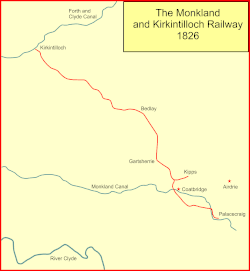 The Monkland and Kirkintilloch Railway (M&KR) was an early mineral railway running from a colliery at Monklands to the Forth and Clyde Canal at Kirkintilloch, Scotland. It was the first railway to use a rail ferry, the first public railway in Scotland,[1] and the first in Scotland to use locomotive power successfully, and it had a great influence on the successful development of the Lanarkshire iron industry. It opened in 1826.