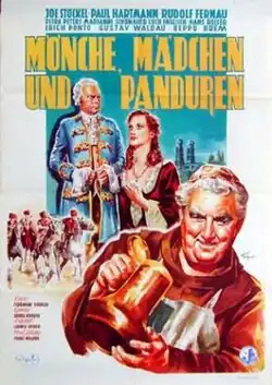 Monks, Girls and Hungarian Soldiers (German: Mönche, Mädchen und Panduren) is a 1952 West German historical adventure comedy film directed by Ferdinand Dörfler and starring Joe Stöckel, Paul Hartmann and Rudolf Fernau.[1] It was made at the Bavaria Studios in Munich. The film's sets were designed by Ludwig Reiber. Some shooting was also done at Nymphenburg Palace.