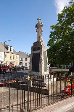 The Monmouth War Memorial is located in Monmouth, Monmouthshire, Wales.[1][2] It is positioned in the centre of St. James' Square, within the roundabout of Whitecross Street, Old Dixton Road, and St. James' Street.[3] The Catalpa tree behind the cenotaph was imported from North America and planted about 1900. At the time of the unveiling of the monument in 1921, the Catalpa was already a mature tree.[4] There are formal plantings on three sides of the memorial. The monument, plantings, and adjacent lawn are surrounded by railings. The Indian Bean Tree, however, was condemned by the Monmouthshire City Council. Opponents of the decision to fell the tree hired a professional arboriculturalist who concluded that the tree could be treated to extend its life.[4]