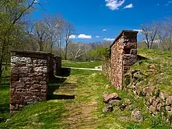 During the American Civil War the Union used the canal to transport war materials and troops along the border between Maryland, Virginia, and points west. For this reason, the canal and the aqueducts were often under Confederate attack. There were many Confederate sympathizers among the canal employees, including Thomas Walter, keeper of Lock 27.[1] Walter loved the South, but he loved the Monocacy Aqueduct more. When he learned that Confederate General D. H. Hill had orders to destroy it in order to halt boat traffic during the Antietam campaign in September 1862, Walter convinced Hill that draining the canal would achieve the same end. Walter saved the Monocacy Aqueduct, only for it to be threatened once again a few days later when another Confederate party attempted to blow up the aqueduct. However, the soldiers were unable to drill enough holes into the hard stone to place enough explosives to breach the structure.