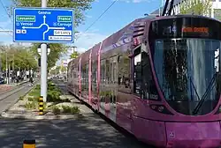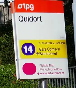 In 2009, the four Geneva municipalities of Lancy, Onex, Confignon and Bernex launched the art & tram art project under the responsibility of the Fonds Cantonal d'Art Contemporain.[5] It included a display of works by renowned artists such as Silvie Defraoui, John M. Armleder, Eric Hattan, Lang/Baumann and Ugo Rondinone along the route of line 14.[6] The last of the artworks, Beautiful Bridge, was unveiled and inaugurated in Bernex in November 1, 2022.[7] Since December 1st 2016 the Monochrome Rose streetcar by Pipilotti Rist has served as a connection between the artworks along the 6.5-kilometre route connecting Cornavin and Bernex.