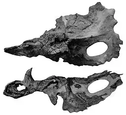 The last position was from 1990 defended by Peter Dodson who claimed that specimen AMNH 3998, the M. crassus lectotype, differed from the Centrosaurus apertus holotype in having a very thin parietal close to the skull frill edge. That this was not simply a matter of individual variation would be proven by the fact that M. lowei had a comparably thin frill.[20] However, in 1997 Scott Sampson and colleagues concluded that the M. crassus lectotype and all comparable Monoclonius specimens referred to nomina dubia because they all represented juveniles or subadult individuals, as could be seen from their juvenile long-grained bone structure. In some cases the adult form is an already-known species, but in others the adult may not yet be known to science. Most centrosaurine species would thus have a "Monoclonius" phase in their ontogeny, which would explain why such specimens can be found from a wide range in time and space.[21]