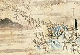 The first appearance of the term in Japanese literature is seen to be in the Nihon Kōki, and according to a quotation of this book from the Nihon Kiryaku of the same time period, in the article of Uruu 12th month of the year Tenchō 7 (830), there is the statement: "Five monks were invited to recite the Diamond Sutra. With some difficulty, the Jingi-kan relieved it. It was the work of a 物恠," and there are also statements about mononoke in the articles in the 8th month Jinshin of the same year, and of year 10 in the 5th month.[6] In the old language of those times, the word "mono" was used to refer to oni, spirits, or Ara-mitama among other things,[1][8] or things that were not felt to be clearly real,[9] and in the Taihō Code, epidemic diseases were written about as "toki no ke" (時気), using the word "ke" to refer to "diseases", and so it is seen that a "mono no ke" (a "ke" of a "mono") was used to refer to diseases caused by these "mono".[1][8] "The Pillow Book" as well, there are names for diseases such as "mune no ke" ("ke" of the chest), "ashi no ke" ("ke" of the feet), and "mono no ke" ("ke" of "mono").[1]