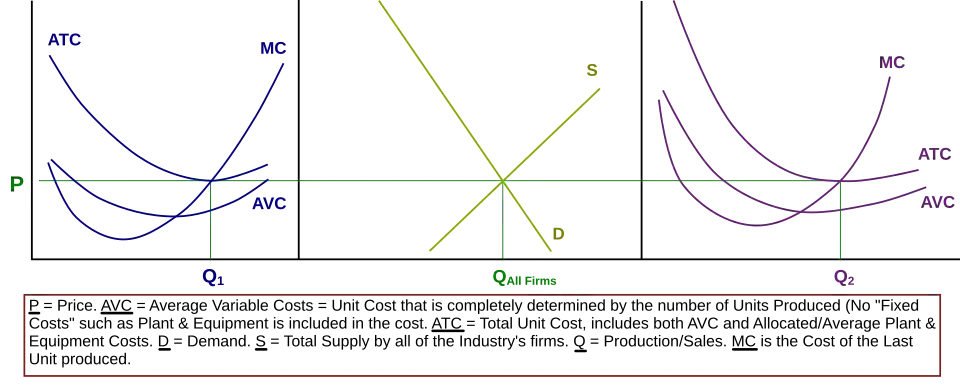 Without barriers to entry and collusion in a market, the existence of a monopoly and monopoly profit cannot persist in the long run.[1][3] Normally, when economic profit exists within an industry, economic agents form new firms in the industry to obtain at least a portion of the existing economic profit.[1][4] As new firms enter the industry, they increase the supply of the product available in the market, and they are forced to charge a lower price to entice consumers to buy the additional supply they are supplying as competition.[1][4][2][3] Since consumers flock toward the lowest price (in search of a bargain), older firms within the industry may lose their existing customers to the new firms entering the industry, and are forced to lower their prices to match the prices set by the new firms.[1][4][3][6] New firms continue to enter the industry until the price of the product is lowered to the point that it is the same as the average economic cost of producing the product, and economic profit disappears.[1][4] When this happens, economic agents outside of the industry find no advantage to entering the industry, supply of the product stops increasing, and the price charged for the product stabilizes.[1][4][2]