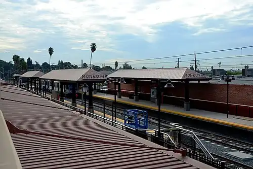 Monrovia station is an at-grade light rail station on the A Line of the Los Angeles Metro Rail system. It is located at the intersection of Duarte Road and Myrtle Avenue in Monrovia, California, after which the station is named. This station opened on March 5, 2016, as part of Phase 2A of the Gold Line Foothill Extension Project.[3][5]