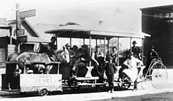 Installed in 1887, a mule-drawn railway with a single passenger car, called the Myrtle Avenue Railroad[6] at that time ran from the Monrovia station up Myrtle Ave to downtown Monrovia. On the way back down to the rail station, the mule was loaded onto a flatcar and downhill gravity took the cars back to the station. By the early 1920s the partially mule-powered streetcar system was removed. In 1906 the first Pacific Electric rail car arrived in Monrovia. The PE Pasadena and Monrovia line ended in 1951. Santa Fe Middle School near the station is named after the Santa Fe Railway.[7]