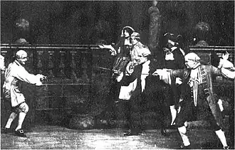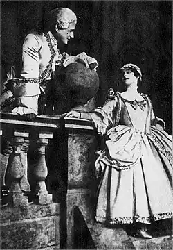 A "romantic comedy" was made from the novel by Evelyn Greenleaf Sutherland. It played first on Broadway from December 1901 to January 1902, directed by and starring Richard Mansfield.[9] It opened in London on 25 October 1902 at the Comedy Theatre, produced by William Greet and Lewis Waller under the management of Frank Curzon and directed by Guy Waller. The cast included Waller as Monsieur Beaucaire and Grace Lane as Lady Mary Carlisle.[10]