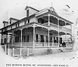 The first Monson House was on the water's edge at 24 Bay Street (now Avenida Menendez), between the Plaza and Fort Marion. An 1885 advertisement claimed rooms for ten boarders at $9-$10/week.[2] In addition to rented rooms, the Monson offered tourists a chance to sail to the Saint Augustine Lighthouse on Anastasia Island on one of four yachts anchored near the club house.