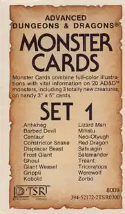The Monster Cards were sets of twenty 3" by 5" cards intended as a Dungeon Master's aid, with each card having a color illustration of a monster on one side and game statistics for the monster on the other side.[1]