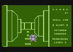 Monster Maze is a game in which the player collects gold bars in a maze while being pursued by monsters.[2] The object is to collect as many gold bars as possible before losing all nine lives, while avoiding monsters that run around the maze. After clearing a maze, the player advances to a new, more difficult level. There are a 48 monsters scattered across the 16 levels and 48 vitamin pills that player can eat. When vitamin-charged, the player can chase a monster for a few steps and kill it.