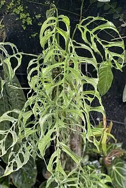 Monstera obliqua is a species of the genus Monstera native to Central and South America.[1] It is hemiepiphytic like most other Monstera species. The plant is particularly known for its foliage, which is, in mature specimens of a few varieties, highly perforated, sometimes described as having more empty space than leaf.[2] An illustration of the general variation in adult leaf shape from different individuals of this species can be found in Michael Madison's A Revision of Monstera.[3] The species is not commonly cultivated, but the name is often misapplied to specimens of the more widespread Monstera adansonii.[4]