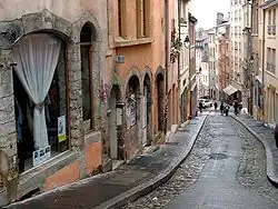 The Montée de la Grande Côte, or the Montée de la Grande-Côte (French pronunciation: [mɔ̃te də la ɡʁɑ̃d kot] ⓘ), is a street of La Croix-Rousse quarter, in the 1st arrondissement of Lyon, which connects the Terreaux quarter and the Plateau de la Croix Rousse. It is characterized by a high elevation and is more narrow at the bottom. The street belongs to the zone that is classified as World Heritage Site by UNESCO.