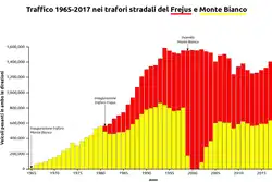An alternative route for road traffic between France to Italy is the Fréjus Road Tunnel. Road traffic grew steadily until 1994, even with the opening of the Fréjus tunnel. Since then, the combined traffic volume of the former has remained roughly constant.