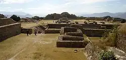 The monumental center of Monte Albán is the Main Plaza, which measures approximately 300 meters by 150 meters. The Main Plaza was created through artificial levelling of the mountaintop, being covered in white plaster afterwards. The plaza would have had the capacity to hold the entire population of the city for participation in state-sponsored rituals.[5] The site's main civic-ceremonial and elite-residential structures are located around it or in its immediate vicinity. Most of these have been explored and restored by Alfonso Caso and his colleagues.