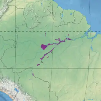 The várzea forests of this ecoregion extend along the low, seasonally flooded rivers of the central and lower basin of the Amazon River, including a large part of the Madeira River basin, the mouth of the Purus River, tributaries of these rivers and an isolated patch of várzea along the Mamoré River between Bolivia and Brazil.[1] Major population centers in or near the ecoregion are Manaus, Itacoatiara, Coari and Óbidos.[2]