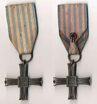 The Monte Cassino Commemorative Cross (Polish: Krzyż Pamiątkowy Monte Cassino) is a commemorative medal awarded to all soldiers of the Polish II Corps who fought in the battle of Monte Cassino and the battles for Piedimonte and Passo Corno. After the capture of Monte Cassino in May 1944, the Polish government-in-exile (in London) created a campaign cross to commemorate the role of the Polish II Corps (often known as Anders Army) in capturing this strategic point, which had long blocked the Allied advance up the Italian peninsula.