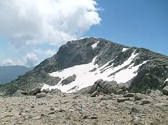 The peak of Monte Renoso is on the boundary between the commune of Ghisoni in Haute-Corse and the communes of Bastelica and Bocognano in Corse-du-Sud.[2] The peak is located on the S-shaped backbone of the island.[3] The 2,247 metres (7,372 ft) Punta Bacinello is to the north, the 2,255 metres (7,398 ft) Punta alla Vetta is to the west and the 2,273 metres (7,457 ft) Punta Orlandino is to the south. Lac de Bastani is to the north of the peak, and Lac de Nielluccio is to the east.[2] Lac de Bastiani is a glacier lake that is ice-covered far into the summer.[3]