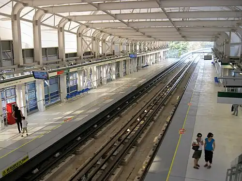 The platforms and tracks are enclosed by a steel-framed structure.[3] The portal frames are rectangular in shape with rounded corners and have different heights, which creates an undulating pattern along the platforms lengthwise. The structure base is overlapped by an arched tensile membrane structure. This portion of the station is laterally covered with sandwich-structured composite panels of aluminum.