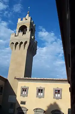 In 1386, Donato Acciaioli, a man who held the titles of Duke of Athens, Senator of Rome and Gonfaloniere of the Republic of Florence, built the tower that still dominates the castle today. In 1396 Donato was banished from Florence, but his assets (including Montegufoni) were saved from confiscation by his brother the cardinal. Donato's three sons resided at the Court of Athens until one of them, Agnolo di Jacopo, returned to Montegufoni with his son (Duke Francesco) and his cousin (it was probably at that time that the name "Court of the Dukes" was born).[3]