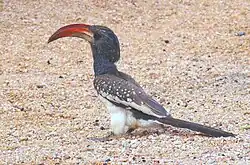 It is a medium-sized bird, 54–58 cm (21–23 in) in length. With a body mass of 210 to 400 g (7.4 to 14.1 oz), it appears to be the largest hornbill of the relatively diminutive Tockus genus.[2] The species is characterized by a white belly, black back, with white spots on the wings and white secondary flight feathers. The outer feathers of the long tail are also white. Females are smaller than males and can be recognized by their turquoise facial skin. The eyes are black and the beak is red.