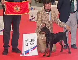 The Montenegrin Mountain Hound (Serbo-Croatian: crnogorski planinski gonič / црногорски планински гонич) is a rare dog breed originating from the mountainous regions of Montenegro. Black and tan, with a smooth coat, the Montenegrin Mountain Hound was called Black Hound in the past. The breed is of the same origin as the other Balkan hounds. It stands 18 to 22 inches (46 to 56 cm) high and weighs 44 to 55 pounds (20 to 25 kg). The breed is used to hunt fox, hare, and small game, occasionally hunting larger animals such as deer or even wild boar.