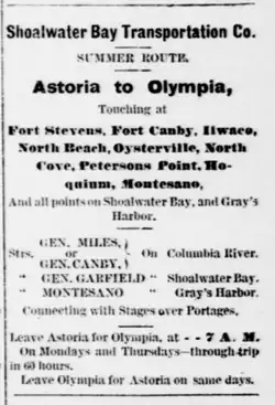 - ^ a b Advertisement, “Shoalwater Bay Transportation Co.”, Daily Astorian, August 17, 1882, page 3, col. 7.