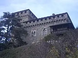 In 1919 a wealthy Milanese family, the Broglio, purchased the property, demolished the extension, and decided to reconstruct the castle according to medieval examples elsewhere in the Valle and abroad.[6] For the exterior they and their architect, Vittorio Mesturino, looked primarily to gothic examples and the overall neo-gothic style in Piedmont, Liguria, Lombardy, and France. For the interior the Broglio and their many excellent carpenters, masons, and other local artisans looked to nearby surviving castles from the late Middle Ages, particularly the fortresses of Issogne, Fenis, and Montalto. With extraordinary speed, they completed the castle and its gardens by 1926 and had the interior frescoed by the renowned Turinese painter Carlo Gaudina. However, a reversal of fortune forced the family to put the property up for sale, and after briefly being held by the Abbegg family, who were originally from Switzerland but were then living in Turin, it was acquired in 1929 by the daughters of the famous Italian violinist, composer, and teacher Rosario Scalero.[7] They then presented it to him upon one of his visits back to the Valle during his tenure at Philadelphia's Curtis Institute of Music.,[8] and during subsequent sojourns at the castle and after his retirement in 1946, he hosted and taught many of his pupils there, including Samuel Barber, George Walker, Nino Rota, Gian Carlo Menotti, and perhaps his most famous American student, Leonard Bernstein.[9]