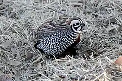 The Montezuma quail (Cyrtonyx montezumae) is a stubby, secretive New World quail of Mexico and some nearby parts of the United States. It is also known as Mearns's quail, the harlequin quail (for the male's striking pattern), and the fool quail (for its behavior).
