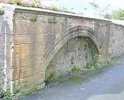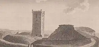 Burials appear to have continued however judging from Francis Grose's comments in 1789 about new tombstones.[22] Following the sale of the barony to the Countess of Eglinton the town burgesses were very concerned about the condition of the tower and it was repaired with a flat roof added.[15] The old Ayr castle stood nearby the church, within the walls of the citadel.[23]