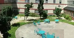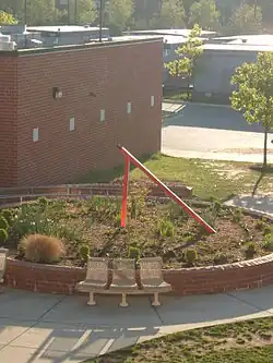 When Montgomery Blair High School's 23.5-acre (95,000 m2) Wayne Avenue campus opened in March 1935, it was the sixth high school in Montgomery County, and the first in the lower county.[6] One of several Montgomery County schools designed during that period by Howard Wright Cutler, the facility then consisted only of the C building, overlooking Sligo Creek. In 1936, the Auxiliary Gymnasium was added, followed by the B building in 1940, and the D building in 1942. MBHS's first football team was founded in 1944, and the War Memorial Stadium opened in 1947.[7] In 1950, the A building was constructed, containing the Blair Library/Media Center. With the addition of the Main Gymnasium/Fieldhouse in 1954, MBHS possessed one of the finest basketball and football facilities in the county.[8] The E building was added in 1959 as an administrative section, followed by the 1969 opening of the 1200-seat auditorium, named for long-time teacher and librarian Elizabeth Stickley.[9] The most recent addition was the automotive shop building in 1973.
