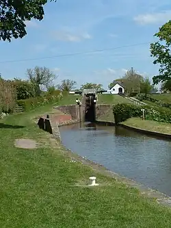 The canal passes through a peat bog which has been drained since the construction of the canal. This lowering of the water level has meant that during restoration the canal had to be lined to prevent leakage and a new lock was required to lower the water level. This lock was named Graham Palmer Lock after the founder of the Waterway Recovery Group.[95] The Perry Aqueduct crosses the River Perry and was replaced during restoration. The old aqueduct had three small arches and restricted the flow on the river in flood conditions. As it was in a poor state of repair, it was replaced by a single span steel structure. Beyond the aqueduct, the canal is very straight as a diversion was built in 1822. (The original route of the canal had followed a less direct path at the insistence of one of the Proprietors, who wanted the canal to serve his Woodhouse Estate.[96])