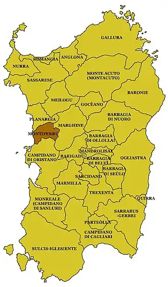 Montiferru is a historical region of central-western Sardinia, Italy. It takes its name from the eponymous extinct volcano massif, whose main peak is the Monte Urtigu (1,050 m). Extending for some 700 km2, the massif had originally a maximum elevation of c. 1,600/1,700 m, later reduced due to erosion.