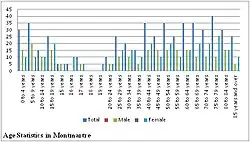 Montmartre has a median age population of 50.2, with 83% over the age of 15. Within Montmartre, males represent 47% of the population, while females account for 53%.[56]