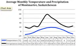 According to the 2011 Census of Canada, the population of Montmartre and its municipal area is 476. This represents an increase of 15.3% from 2006 when the population was 413. There are a total of 218 private dwellings within Montmartre and its surroundings. The village has a population density of 0.3 per square kilometer in a land area of 1,047.83 square kilometers.[56]