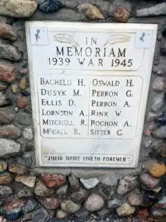 A number of residents of the town served as well as died in World War II. Michael Dusyk, of Montmartre was killed on September 27, 1944, and is buried at Gradara war cemetery, Pesaro, Italy. He was from a homestead southeast of Montmartre. Dusyk Lake, north east of Uranium City is named in his honour. Joseph Perron was killed on October 4, 1944, and is buried at Becklingen War Cemetery near Soltau, Germany. Perron Lake southeast of Fontaine Lake is named in his honour. Gaetan Perron died on April 18, 1945, and is buried at Holten Canadian War Cemetery, Netherlands. Perron Island in Oliver Lake is named in his honour. Others killed include Donald Hollowell, Spencer W. Hollowell, Rex Mitchell, Antoine Perron, and Aldon Joseph Rochon.[36]