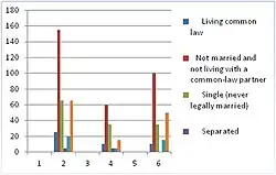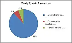 In Montmartre, the majority of the population are married or living with a common law partner. This group makes up 50% of the population. Married and not separated account for 44% of the population. Single residents account for 14% of the population and separated, divorced and widowed individuals make up 19% of the population.[56]