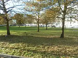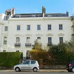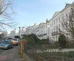 Thomas Read Kemp's finances were overstretched by his involvement with the Kemp Town estate east of Brighton, and by the time he fled to France in 1837[14] he had sold or given away most of his landholding in the Montpelier area. Parcels of land were bought by builders and speculators, and a series of carefully planned "set-piece" residential developments were laid out.[15] Work on Montpelier Crescent started in 1843,[2] on and behind a stretch of Kemp's land previously occupied by a cricket pitch.[16] The Lillywhite's Ground (also known as the Temple Fields Ground) was in use between 1831 and 1844[17] and was one of Brighton Cricket Club's venues.[18] Amon Henry Wilds was commissioned to design the first set of houses; in view of the vast scale he worked to, which was unusual on a site so far inland from the coast,[2] the crescent has been called "the grandest of his many works".[18][19] The houses lacked a sea view, as they faced northwest towards the open land of the South Downs.[2] The crescent was completed in 1847; within ten years, the downland vista had been obscured by the construction of Vernon Terrace opposite.[20] This "impressive" set of four-storey terraced houses, dating from between 1856 and the mid-1860s, lined the west side of the former Montpelier Road, which by this stage had been renamed except for the stretch south of Denmark Villas.[20][21] Between the east side of Vernon Terrace and the crescent, a curved area of green space was retained.[16]