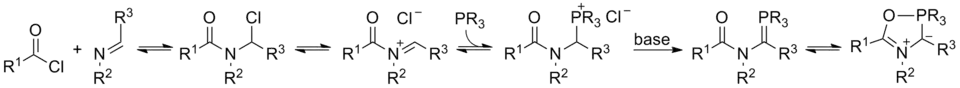 Montréalones are related to Wittig reagents and can be generated in a similar fashion. Reaction of organophosphorus(III) compounds with N-acyliminium ions affords phosphonium salt intermediates which are deprotonated using non-nucleophilic bases (e.g. DBU, LiHMDS). N-Acyliminium ions are generated in situ from acid chlorides and imines such that the '1,3-dipole' itself is generated in a multi-component reaction. The most efficient phosphorus(III) precursor for dipole synthesis is 2-phenylbenzo[d][1,3,2]dioxaphosphole [PhP(catechyl)] owing to the balance of nucleophilicity and electrophilicity that it affords.[4]