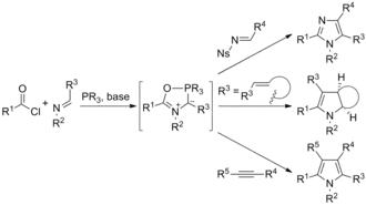 Montréalones participate in 1,3-dipolar cycloaddition reactions with dipolarophiles such as imines, alkenes, and alkynes to respectively afford imidazoles,[6] 2-pyrrolines,[7] and pyrroles.[3][8] The latter heterocyclic products were obtained by multi-component reactions involving in situ-generation of montréalones from imines, acid chlorides, and phosphonites prior to one-pot reactions with the dipolarophile. Moreover, conjugated poly(1,3-dipole) variants of montréalones have been generated and used in the synthesis of polyheterocycles related to polypyrroles.[9][10]