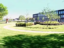 In 1955 plans were unveiled for new buildings to be added to the old Montrose Academy. Houses in the Academy Square were demolished and £250,000 set aside.[58] The 1961 extension, officially declared open on 23 October of that year, brought into use two three-storey blocks attached to the 1841 additions.[31] The major work of the last Extension in 1988-89 was the building of the East Wing, a two-storey block linked to the old West Wing by walkways.[59] It contains a number of teaching areas in addition to a Library, Communications Studio, Social Areas and Dining Room. In 2000, the 'Millenium Garden' was developed in the West Wing courtyard.[59]