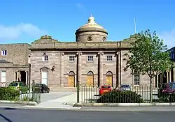 In the first quarter of the eighteenth century, an "English School" opened in the town. The school taught music, French, writing, arithmetic, book-keeping, geometry and navigation.[25] By the late eighteenth century, the old Grammar School was in ruins. Construction of the 'New Schools', designed by Andrew Barrie, commenced in 1787 and was completed the following year.[26] The buildings were constructed on the Mid Links, an area of parkland in the town,[27] and contained separate accommodation for the Grammar School, English School and Writing School.[28] Between the ruin of the old Grammar School and the building of the 'New Schools', the Grammar School operated from rooms in the Town House.[28]