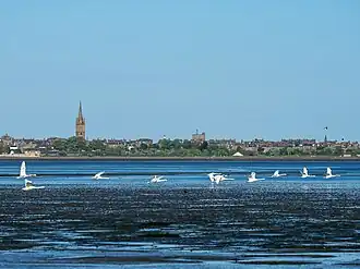 The extensive mudflats are home to large populations of invertebrates, especially annelid worms, the snail Hydrobia and the amphipod Corophium. There are also beds of mussels Mytilus edulis. The flora includes beds consisting of three species of eel grass, Zostera, and algae. The mudflats support numbers of waders and wildfowl including Eurasian oystercatcher, common redshank, red knot, mute swan, Eurasian wigeon and common eider. Large flocks of pink-footed goose and greylag goose use the basin to roost in and feed in the surrounding farmland. As well as wintering eiders the basin supports a large breeding population.[2] In all 213 species of bird have been recorded on the basin, most being winter visitors or passage migrants and just over 50 species are thought to breed.[4]