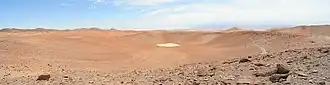 An old Inca road, which goes from the Pacific Ocean to San Pedro de Atacama and further to Argentina, runs 100–200 m (330–660 ft) from the crater.[7][8] The crater has been deemed by Stanislav Kaniansky and Kristian Molnár to be one of the "most impressive" in the world[9] and has a high scenic and historical value.[10] The Chilean Geological Society has defined it as one of the geosites of Chile,[11] although such a classification has no legal effect[12] and the crater is threatened by erosion caused by vehicles and the over-collection of rocks.[10] In 2017, several Chilean organizations and the community of Peine petitioned the Chilean government to declare the site a historic monument.[13] Monturaqui crater is a tourist attraction in the area,[14] which has led to the removal of meteoritic rocks and damage to the crater.[15]