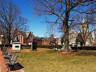 The historic district also contains many 19th-century buildings, and the area was added to the National Register of Historic Places in 1982. The city hall and various churches and businesses are adjacent to the square.