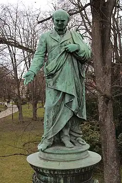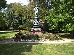 The Monument of Adalbert Lanna the Elder is a sculpture of Adalbert Lanna the Elder in České Budějovice in the Czech Republic. It is located in the Sady city park near the western end of Lannova třída Street. It was created between 1866 and 1879 in the Imperial-royal artistic foundry in Wieden (in Vienna) under the artistic direction of Franz Pönninger. It was paid for largely from a long-term public money collection, which was initiated by the city council of České Budějovice to honor the deceased Adalbert Lanna the Elder, who was a local native. In May 1945, it was torn down by a crowd, severely damaged and removed to a secluded place. Its partial restoration and re-erection took place in 1993.