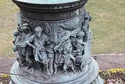 As early as February 1866, the director of the Viennese Imperial-royal artistic foundry in Wieden, Anton Fernkorn, announced his offer to create the monument. The money collection was taking off, among the largest contributors was Lanna's friend, duke Johann Adolf II of Schwarzenberg of Hluboká nad Vltavou.[2] After a break caused by the Austro-Prussian War and the cholera epidemic in České Budějovice,[3]: 27 another meeting of the Committee was held. This meeting was also attended by Wenzel Rosenauer – deputy of the Imperial Council, who lived mostly in Vienna. There he managed to obtain promises of further significant financial resources, among others, from the procurator of the Lanna company, Moritz Gröbe, and Anton Banhans (the future Minister of Agriculture). At that time, the Committee was still hesitant about who to entrust the creation of the monument to. In the end it was awarded to the Imperial-royal foundry in Wieden, which – in the meantime – had been taken over from Fernkorn by his successor Franz Pönninger. In July 1868, Pönninger sent his first proposal from Vienna, which already included the cylindrical pedestal covered by reliefs, on which the statue of Adalbert Lanna the Elder would stand. Further modifications were made during the course of the project,[notes 1] but finally in March 1874 Franz Pönninger committed to a final budget of 20,500 florins and the deadline for the erection of the monument was set on the autumn of the following year.[2]
