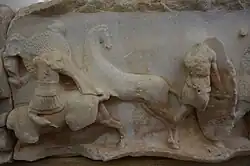 On one side of the frieze, a riderless horse appears dominating the scene. This alludes to the story that said the battle developed from pickets skirmishing over an escaped horse (or mule).[10] Legends said an oracle predicted that whichever side started the battle would lose. Before the battle, a Roman horse got loose and ran towards the opposition, which caused Perseus to assume the Romans had initiated battle. When he attacked in return, Perseus then started the battle himself.[8] For this reason, the riderless horse indicates that the relief specifically depicts the Battle of Pydna, opposed to some generic scene of combat between the Romans and Macedonians. Some suggest that each panel should be read as a different phase of the battle, from the initial skirmishing to the final rout. Taylor argues that the four reliefs together were intended to depict a single scene of Roman victory, and that the prominence of cavalry throughout alludes to the successful mounted pursuit of fleeing Macedonians after the phalanx had broken.[9]