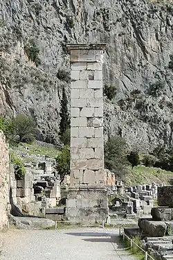 The stele of Prusias is located to the northeast of the entrance of the temple of Apollo in the archaeological site of Delphi. It has been restored in situ. The monument has been identified through an inscription mentioning that it was dedicated by the Aetolian League to honour king Prusias II of Bithynia, in northwestern Asia Minor: «Βασιλέα Προυσίαν, βασιλέως Προυσία, τò Κοινò τῶν Αἰτωλῶν, ἀρετᾶς ἔνεκεν καὶ εὐεργεσίας τάς ἐς αὑτούς».(To the king Prusias, son of king Prusias, the Aetolian League for his virtue and the benefactions he bestowed upon them).[1] Due to this inscription it was also possible to date the ex voto after 182 BC, when Prusias II succeeded his father, Prusias I, on the throne of Bithynia.