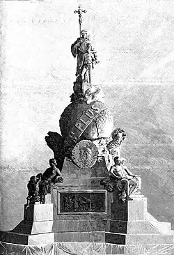 Conceived in the context of the celebrations for the 400th anniversary of Columbus' arrival to the Americas, the project follows a design by Antonio Susillo (died 1896).[1] Commissioned by the Spanish Government,[1] the bronze parts were cast in Paris at the Thiébaut Frères' foundry. The monument was initially intended to be erected at Havana's Parque Central, yet the Cuban rebellion and ensuing independence from Spain aborted such plans.[2] The bronze elements remained then in Paris while the ashlar pieces were stored in Pontevedra.[2] Valladolid, death place of the Genoese explorer, competed with other Spanish cities such as Seville and Madrid for the monument.[2] The Council of Ministers decided to award the monument to the city of Valladolid in 1901.[2]